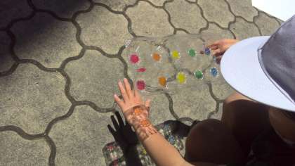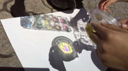 透明な素材に光を通してみると…。影がキラキラ輝いて見えたり、ゆらゆら動いて見えることに驚きました。色を塗ったり模様を描いたりしたら、もっと素敵になりそう!ということで、ペンで色をつけていきました。中庭に出て光を当てると、子ども達からは大歓声が上がりました。「すごい!カラフルな宝石みたい!」「青い色をつけた容器に水を入れて光を通すと、海みたい!」「手に映しても面白い。」と、たくさんの発見をしていました。