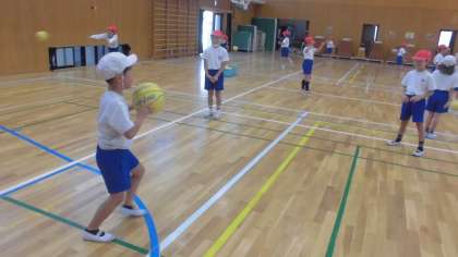 今日はパスの種類や、パスをするとき・キャッチするときのコツを知りました。ペアになってパスの練習をした後は、3人組で攻守に分かれてミニゲームもしました。