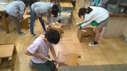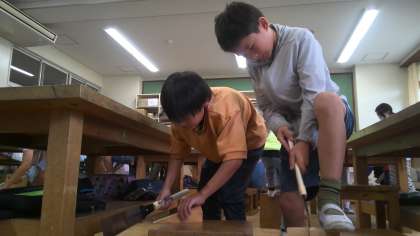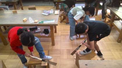 力が体中に入って腕が痛くなったり手が痛くなったりしながらもどんどんギコギコ!ちょっと分厚い木材にも挑戦し、コツをつかんでいっていました。ヒノキ材も切ったので、図工室中にホワンといい香りをさせつつ、のこぎりを楽しみました。次はトントンです!