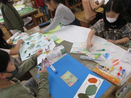 図画工作科では、スパッタリングやドリッピング、デカルコマニーや吹き流し等、色々な技法を使って現代アート風の作品を作りました。