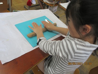 図画工作では、初めて粘土を使いました。新しい粘土は、硬くて使いにくい…。そこで、今日は「ねんどの体操」をすることにしました。箱から出した粘土をちぎって丸めたり、上に積み重ねたり、引き伸ばして長くしたり。みんなで粘土の感触を楽しみながら、やわらかくすることができました。