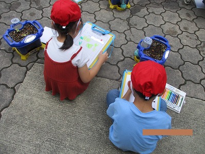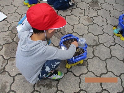 毎朝あさがおの様子を見に行っている子どもたち。「先生!あさがおの芽が出てる!」ということで、前回の生活科の時間に、あさがおの芽の観察をしました。