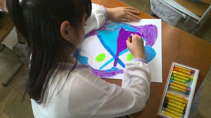 今日は「ふしぎなたまご」をクレパスで描いていきました。まずは想像を膨らませ、どんな「ふしぎなたまご」があるのかを考えました。すると、こどもたちからは「おかしがでてきそうなたまご」「きょうりゅうがうまれそうなたまご」と自由に想像を膨らませていました。大切に描いたたまごを割る時には「えー!たまご割っちゃうの?!」と名残惜しそうにはさみでたまごを割っていました。来週は、「ふしぎなたまご」から生まれるおもしろいものやお話を描いていきます!