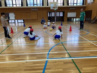 先生が転がすボールから逃げたり、チームで対戦したりして楽しみました。