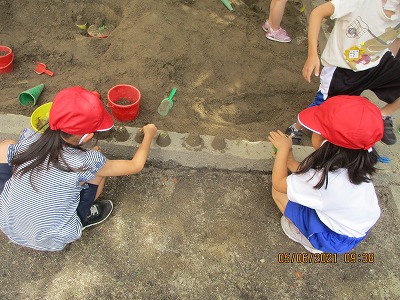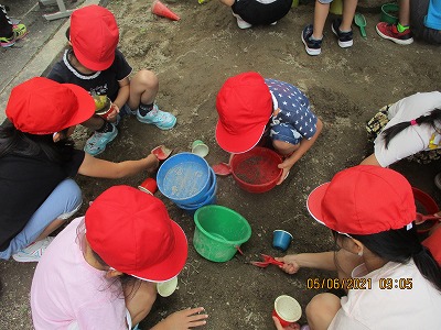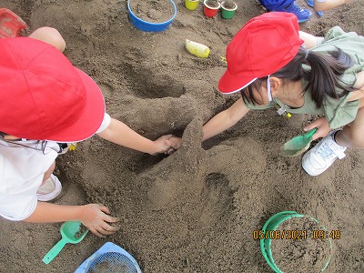 「すなやつちとなかよし」の学習で、砂遊びをしました。バケツやカップを使ってケーキを作ったり、スコップを使って穴を掘り、トンネルを作ったりといろいろな楽しみ方ができました。友達と協力して作品を作る姿も見られ、笑顔で学習を終えることができました♪