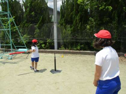 ボールをよく見て打つのは難しいですが、なんども練習しているとバッティングフォームも整ってきてかっこよくなりました。