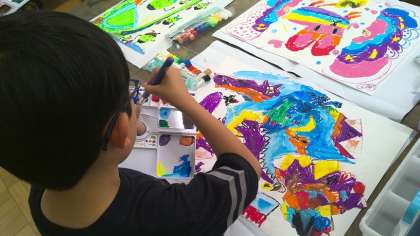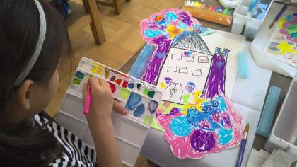 今日は「ふしぎなたまご」からどんなものが生まれるのか、イメージを膨らませながら描いていきました。背景の広い部分は絵の具を使って色を塗っていきます。2年生にとって初めのて絵の具でしたが、絵の具の使い方をよく聞いて、色を混ぜていきました。すると・・「赤と青をまぜたら紫色になった!」「この色きれい!」とできた色を見て大喜びでした。  また水の量を調整すると、色の薄さや濃さを変えられることに気づいていました。一人一人がイメージをふくらませながら、ふしぎなたまごから生まれたお話を描くことができました。