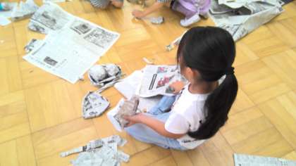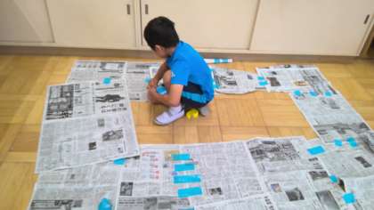 今日は新聞紙を丸めたり、やぶいたり、広げたりしながら新聞紙となかよくなりました。新聞紙を広げてつないでみると・・「秘密基地になった!」「道みたいに長くなってきた」といろいろなことに気づいて作っていました。また、新聞紙をくしゃくしゃに丸めてボールの形にしてボーリングを作って遊んだり、班の友だちと力を合わせて作る姿も見られました。やぶいて顔を出したり、新聞紙を何枚も重ねてドアを作ったり工夫しながら、新聞紙となかよくなることができました。