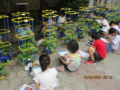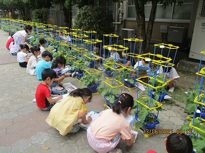 生活科で育てているアサガオが、ぐんぐん成長しています。つるが伸びてきたので、倒れてしまわないようにするためにはどうしたらよいかを考え、支柱を立てました。つるがくるくると巻き付いている様子を見て、子どもたちはうれしそうにしていました。