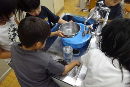 身の回りの物や家庭科室にある食器等にどれ位の水が入るか、予想を立ててからリットルますなどを使って量りました。