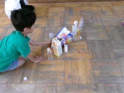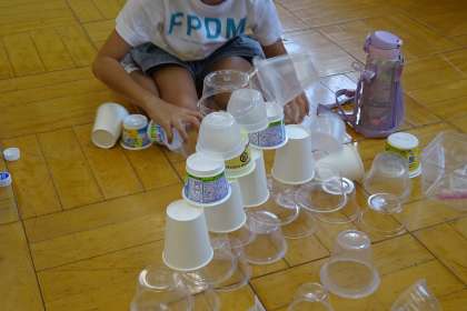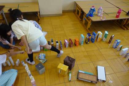 「あそんでためしてくふうして」の学習で、廃材を使って遊びました。