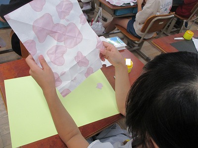 生活科で育てていたあさがおの花びらを使って、色水遊びをしました。花びらを絞ってみると…。紫色のきれいな色水ができました。その水に和紙を浸して色を付けると、子ども達からは歓声があがりました。