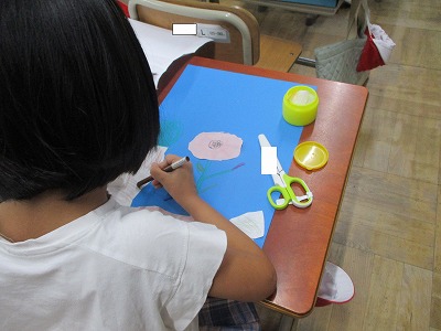 きれいに染まった和紙は、はさみで切って色画用紙に貼り、クレパスで色を付けて作品にしました。それぞれ、大切に育てたあさがおに「最後まで楽しませてくれてありがとう!」と感謝の気持ちをもちながら活動することができました。