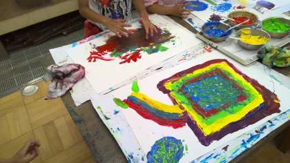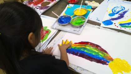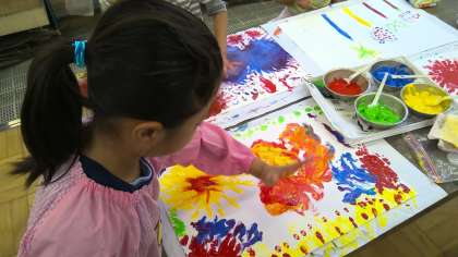 今日は、先週に引き続いて「とろとろえのぐ」を指先や手のひらにつけて、自分が表したい世界を描きました。初めは、とろとろ絵の具の感触に驚いていた子どもたちも、2回目になると「赤色に黄色を重ねてみるとオレンジになった!」「絵の具をのばしたら虹みたいになった!」と絵の具に慣れて、とろとろ絵の具のさわった感じを楽しんでいました。指先や手のひら全体を使って、「かんじたまま」に自分が表したい世界を表すことができました。