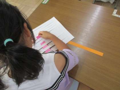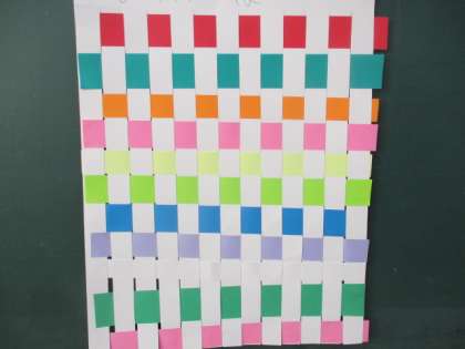 縦に切った白の画用紙の間を、色画用紙で上下に編んでいきます。