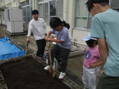 みんなで雑草を抜いて、そのあとスコップで土を耕してフワフワにしました。雑草でいっぱいだった畑が、1時間ですっきり!!みんな頑張りました!