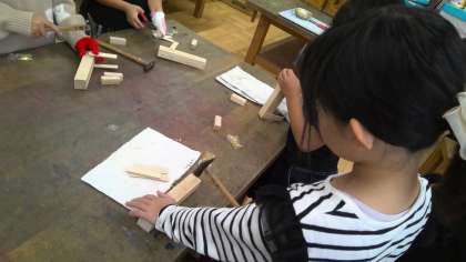 今日は、金づちとくぎを使って木にどんどんくぎをうっていきました。初めに金づちの使い方を確認し、みんなでくぎを打ってみました。「くぎが曲がった!」「まっすぐうてない!」と苦戦しながらも、授業の後半になると、トントントンと、リズムよくくぎを打つ音が聞こえてきました。わきをしめて、ひじから金づちを動かすことを意識して、集中してくぎをうっていました。くぎの高さを変えたりしながら、いろいろな表し方を試していました。来週はさらにくぎをうって、絵の具で色を塗りかざりつけをしていきます!