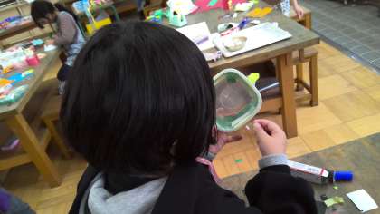 とっても楽しそうに作品を作っていました。作品が出来上がってくると、友だちと協力しながらひもをピンと引っ張って角度をつけながら、作品を滑らせて遊んでいました。
