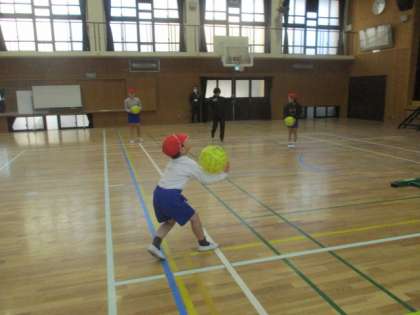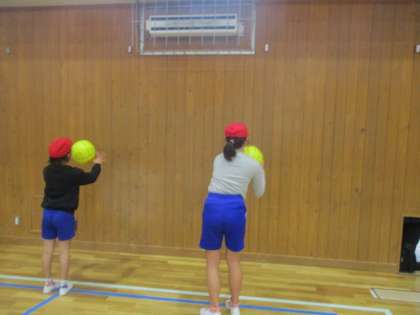 今日は、ソフトバレーボールを使って、ボールを投げたり受けたりする練習や、壁に向かって打つ練習をしました。
