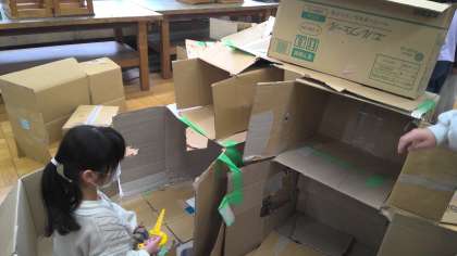 ダンボールカッターを使いながら穴をあけて家の窓やのぞき穴にしたり、下駄箱を作ったりしている子どもたちもいました。