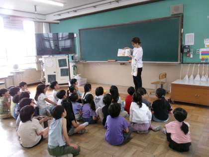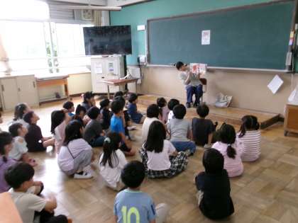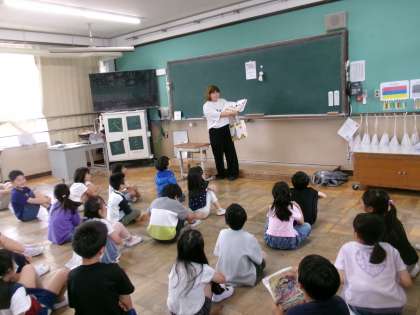 今日は、2年生の教室で「おふくさんのてるてるぼうず」を読んでいただきました。てるてるぼうずの歌を歌う場面もあり、とても楽しそうにお話を聞いていました。