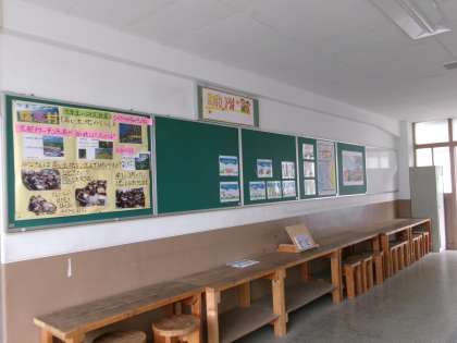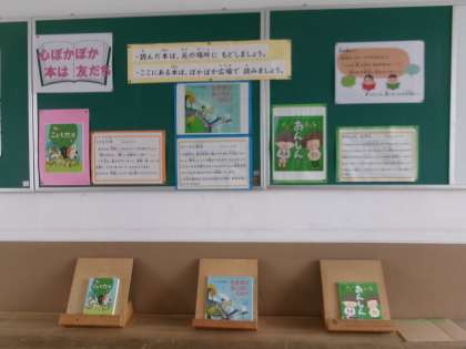 本館と南校舎をつなぐ2階の渡り廊下付近に「ぽかぽか広場」があります。ぽかぽか広場には、本の紹介や朝会の校長先生のお話、グランドデザインなどが掲示してあります。また、先日行われた5年生社会科の研究授業の様子についても紹介しています。