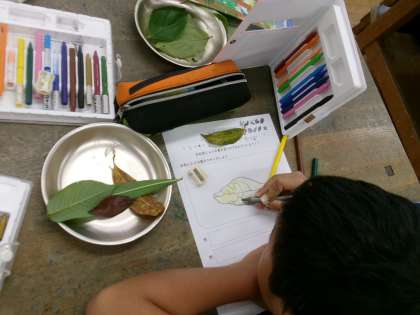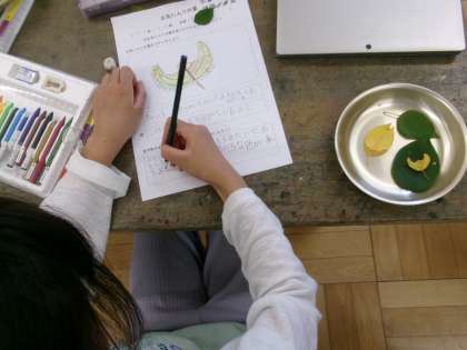 お気に入りの葉を探し、色や形をよく観察した後にスケッチしました。同じ緑や茶色でも、葉によってたくさん種類があることに気付くことができました。