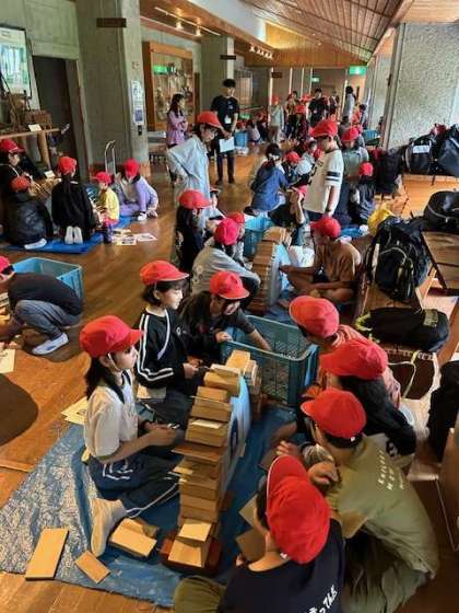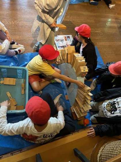 木のブロックや板をアーチ状に組み立て、真ん中の型を抜くことができたら成功です。