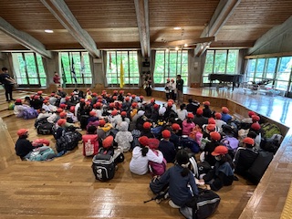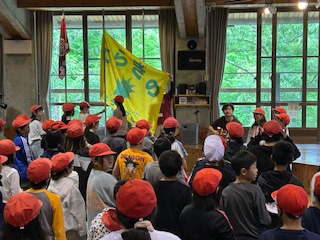 校旗を降ろしながら、山の家に向けて作ったオリジナルソング「出会えてよかった」を歌いました。