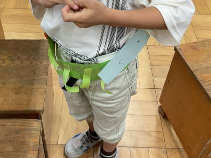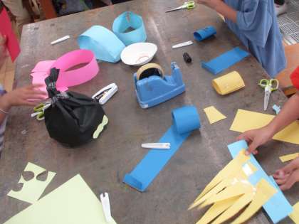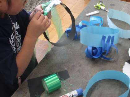 まずは、輪ゴムを使ったわっかの作り方を一緒に確認しました。それから変身したいものを考え、それに合う飾りを作りました。
