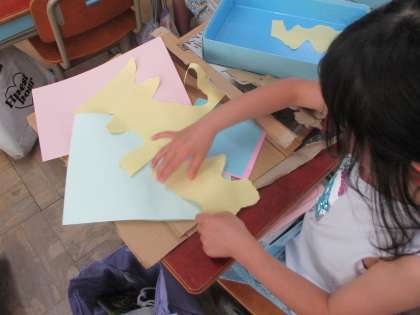 まずは紙の破りました。大きくしたり小さく、細くしたり、曲がったり…と工夫をし、その後はやぶいた形が「何に見えるかな?」と考えました。