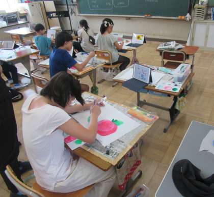 和紙に夏野菜や夏をイメージした絵を絵の具で描きました。