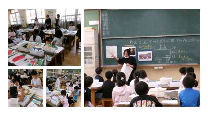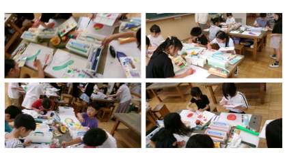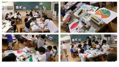 7月19日から21日に行われる上賀茂アートプロジェクトで飾る行灯の絵をかきました。上賀茂神社アートプロジェクト代表の堀川様、教育委員会、京都芸術大学関係者の方々にも来ていただきました。みずみずしい夏野菜を、絵の具をつかってのびのびと表現していました。