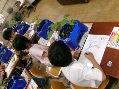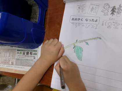 あさがおをのつるがの伸びてきました。成長の様子を観察カードにかきました。「つるにはふさふさの毛が生えているよ」「小さい葉っぱがでてきてるね。」「ここだけ色が違うなあ」と、よく見て絵に表していました。1年生、観察がとても上手です!