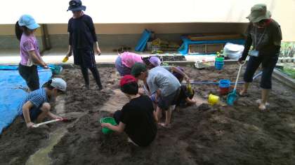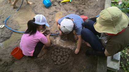 土の感触を裸足で確かめた後、水が流れるように土を掘り、川をつくりました。