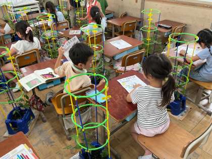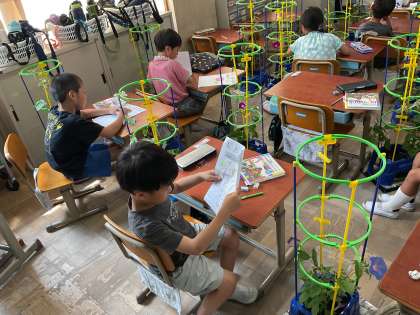 生活科の学習でアサガオを育てています。今日は前と違うところを探しながら観察していました。「花が咲いたよ!」「私のは紫色!」「僕は青の花が咲いた!!」と嬉しそうに報告してくれました。かいたカードとアサガオを見比べたり、友達と伝え合ったりしながら観察をしていました。