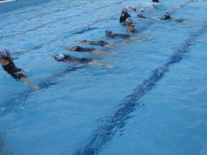 蹴伸びでは、はじめに腕の形を確認しました。実際にやってみると一蹴りで進む距離が前より長くなっており、上手に浮けている子がたくさんいました。