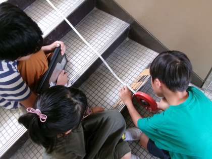 巻尺を使って、校内のいろいろな場所を測りました。階段や廊下の長さ、運動場の鉄棒やうんていなど、自分たちが気になった場所を測っていました。iPadを使って記録をしました。