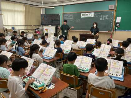 「なかよし」という曲を歌の組と鍵盤ハーモニカの組に分かれて演奏しました。ドレミの歌詞が出てくるところを鍵盤ハーモニカで演奏します。歌も鍵盤ハーモニカの演奏もとても上手でした。