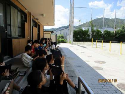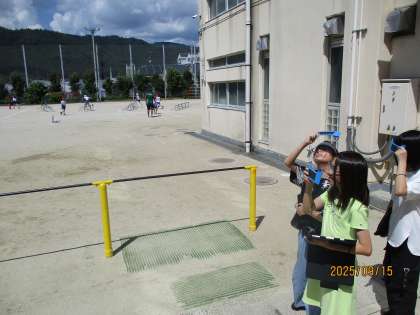 月の観察を行いました。月や太陽がどの方位に見えるのかを確かめながら、月の形の変化と太陽との関係について学んでいきます。月を見つけたときには、「月、見つけた!見えた、見えた!」と、子どもたちの喜ぶ声が聞こえてきました。