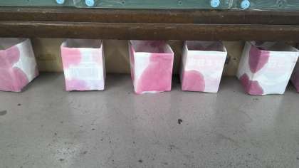 乾かした牛乳パックに丁寧に貼り付けて作りました。