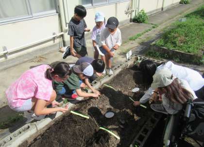 生活単元学習の時間に、にんじんやたまねぎの種、じゃがいもの種芋を植えました。早く芽が出るように、朝の水やりをがんばっていきましょう。