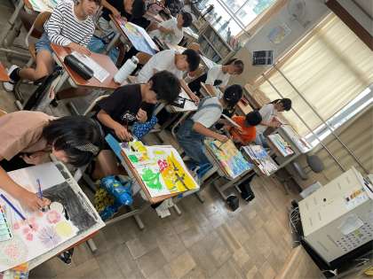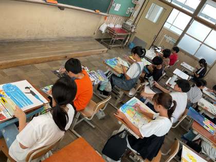 お話を絵にしています。だんだんと完成に近づいてきました。水の量や絵の具の濃さに気をつけて、塗り進めています。細かいところまでこだわって、丁寧に描いていました。