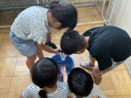 今日は水の量「かさ」を比べました。空き瓶やペットボトルなどのいろいろな容器に入っている水は、どちらがどれだけ多いかを、同じ大きさの容器を使って考えました。実際に水を入れて調べました。