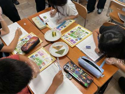 実際に、生八つ橋やバームクーヘンを観察して気付いたことや、生産量から疑問に思ったことを出し合い、学習問題を作りました。