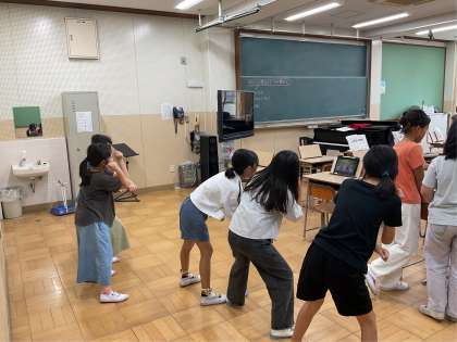 これまでに地域に伝わる踊りや舞いの音楽を聴いたり調べたりしてきました。今日の授業では、南中ソーランや福知山音頭など、グループに分かれて実際に踊りました。踊りの振り付けが難しいところは動画を見ながら繰り返し練習をしていました。