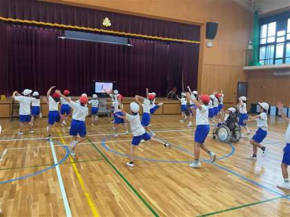 グループに分かれてダンスの練習をしています。ギガ端末でお手本を見たり自分たちを撮影したりしながら、どのグループも夢中で練習していました。スポーツフェスティバルが楽しみです。