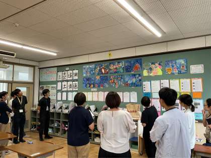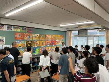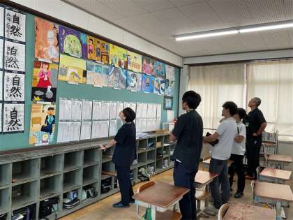 図画工作科の教職員研修を行いました。校内にはお話の絵が飾られています。全学年・学級の絵を実際に見ながら、子どもたちの作品のよさを探したり、評価のポイントを教えていただいたりしました。