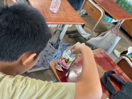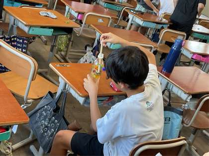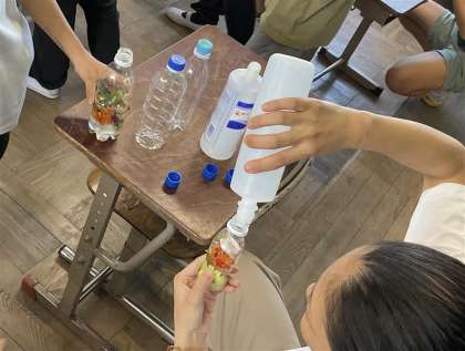 学校の敷地内に生えている草花をつかって、ハーバリウムやスノードームを作りました。ペットボトルの中に、草花やビーズをバランスよく配置していました。みずのりを入れて完成です。きれいな作品が出来上がりました。