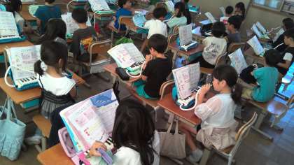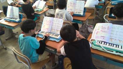 鍵盤ハーモニカで「山のポルカ」を吹きました。おとなりどうしで見合い、指使いが正しいか確認をしました。「吹けてるよ!」「できた!!」と顔を見合わせながら嬉しそうに話していました。